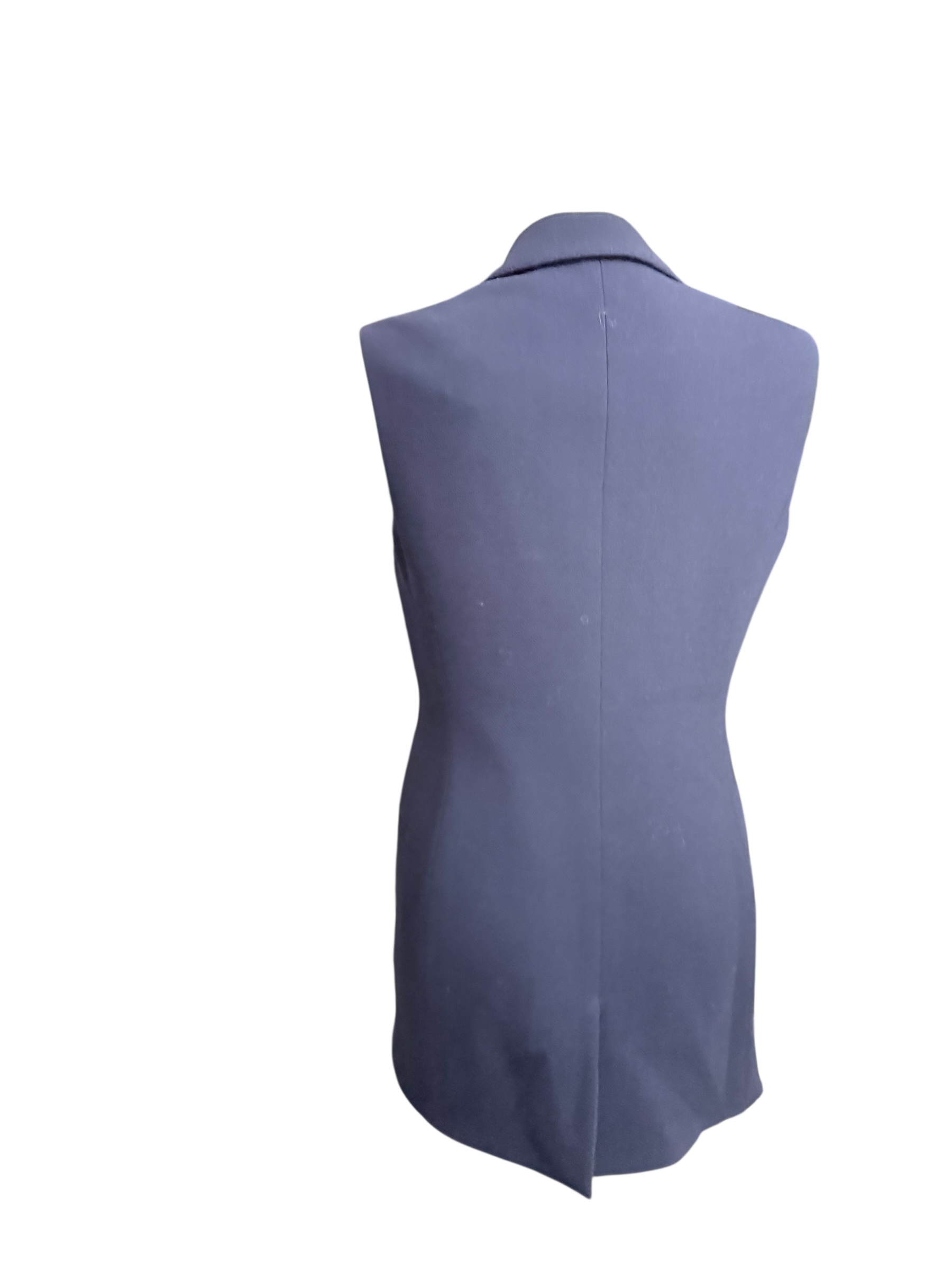 Cette veste Dior sans manche est une pièce d'une élégance minimaliste et d'une précision de coupe remarquable. Bleu marine, elle présente une silhouette allongée et structurée qui souligne la taille avec subtilité. Le design est défini par de larges revers en pointe et une fermeture asymétrique à un seul bouton, créant un décolleté plongeant sophistiqué qui apporte une touche de modernité au tailleur classique.