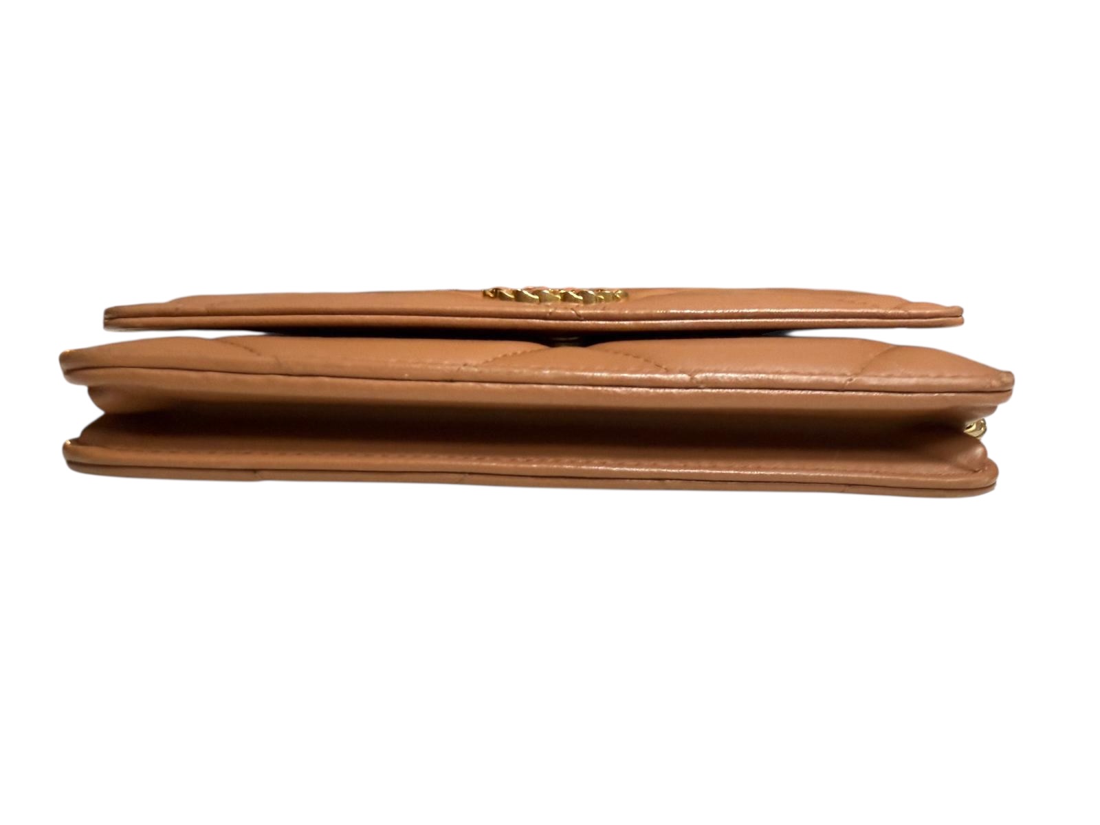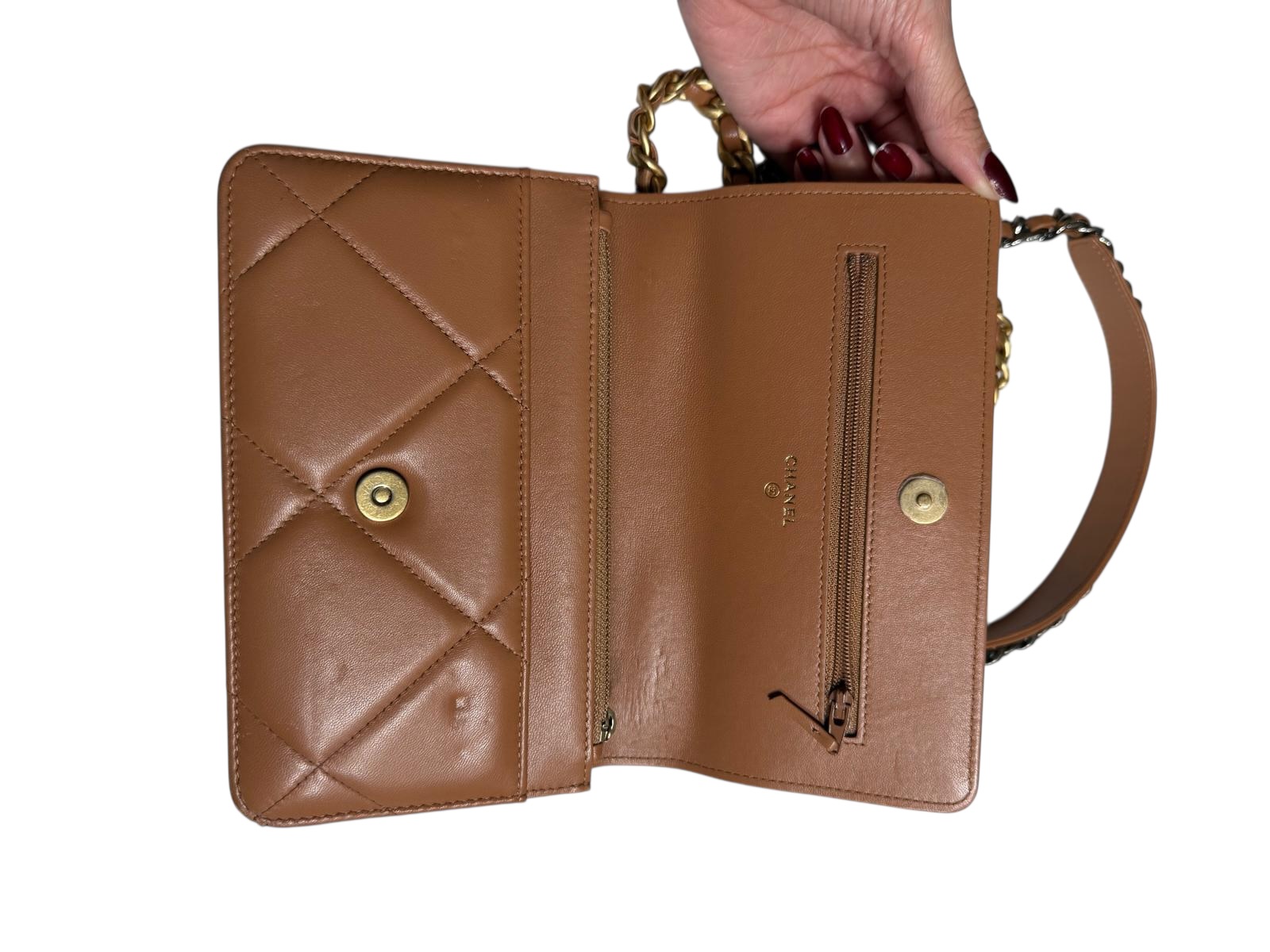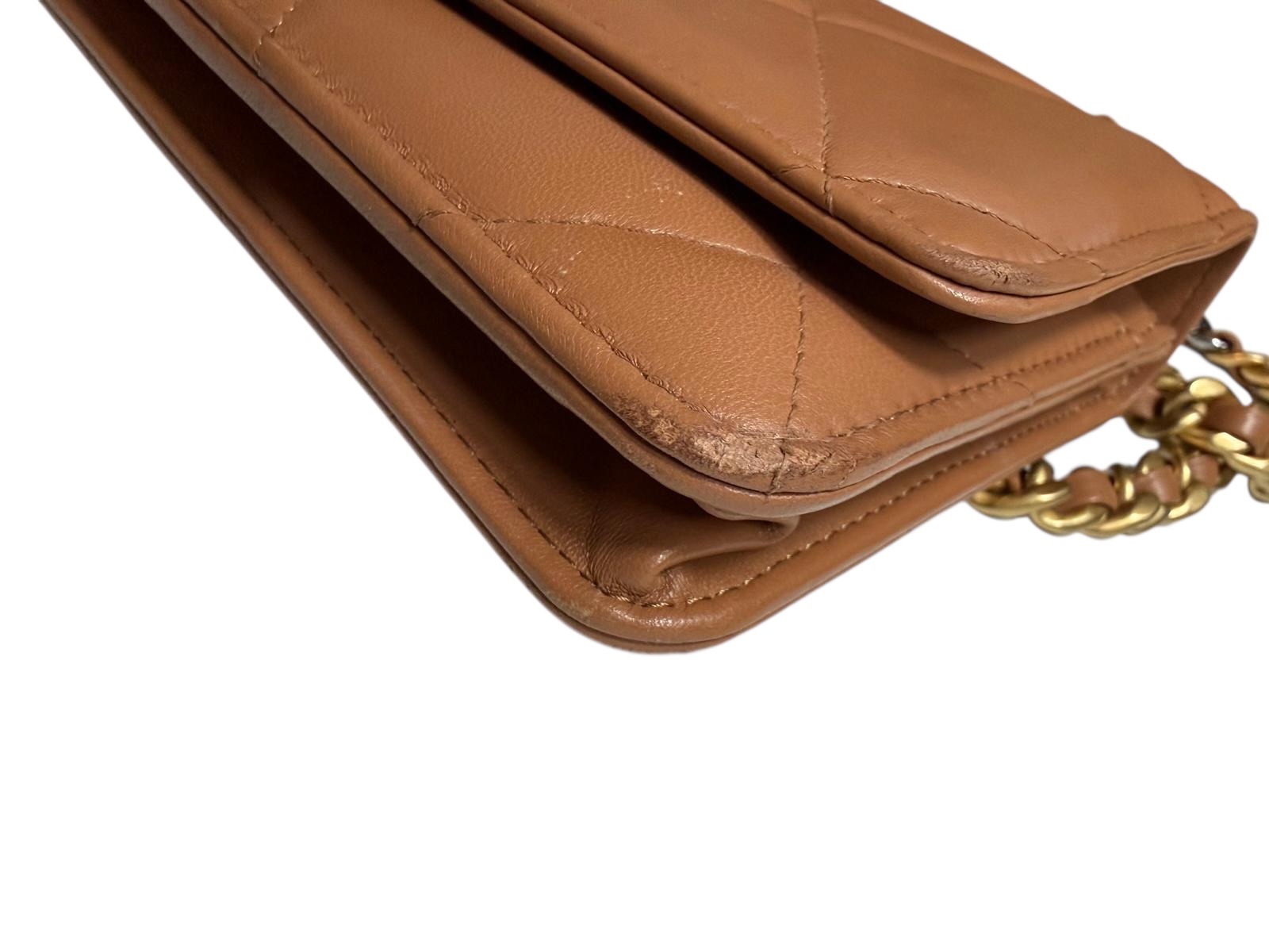 Ce Wallet On Chain Chanel est une déclinaison ingénieuse et compacte de l'emblématique sac Chanel 19, combinant l'élégance d'un sac à main et la praticité d'un portefeuille. Confectionné dans un cuir de chèvre souple de couleur caramel, il arbore le matelassage oversize en losanges, signature de cette ligne moderne.